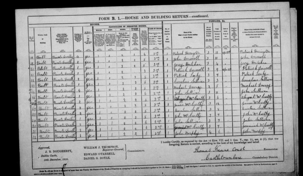 | Sullivan | Cornelious | 3 | Male | Son | Roman Catholic | Co Cork | – | – | English | Single |