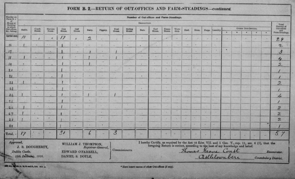 Quinlan has now returned from the USA, having been there from 1908 til 1910. Quinlan and Julia now have three more children and his mother and aunt have died. The four older children are shown as speaking some Irish, while the two youngest only speak English. This may be because Quinlan’s mother, who only spoke Irish is no longer alive. As well as the main form, there are two others providing further details about the house and outbuildings. Row 28 contains the relevant information for Quinlan’s property.