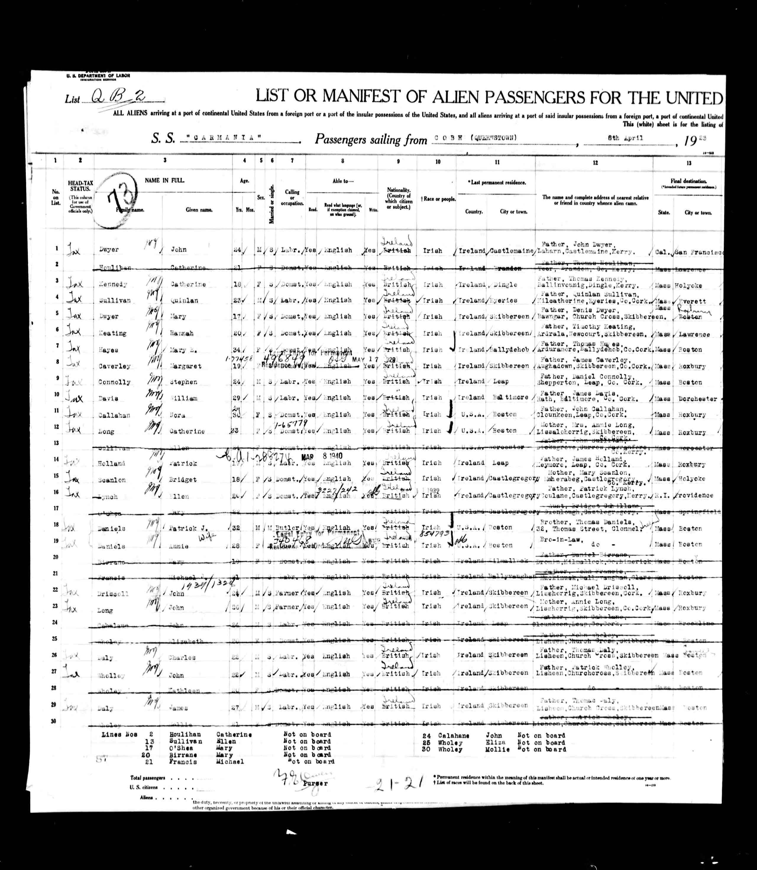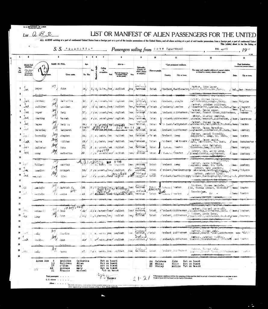 In 1923, Quinlan sailed on the SS Carmania to Boston. The details recorded were: