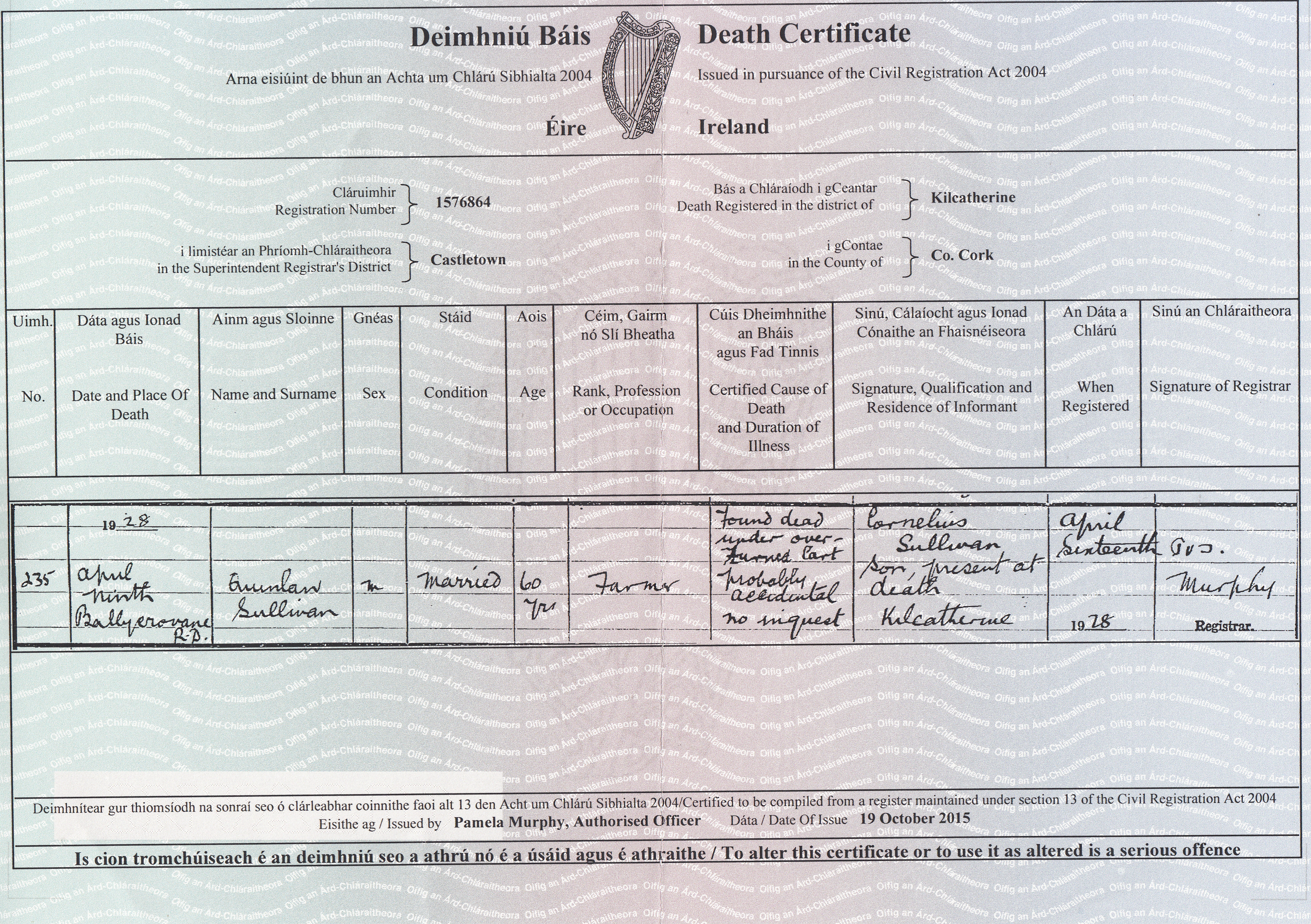 These documents describe the circumstances of Quinlan’s death on April 9th 1928. He was found dead under an upturned cart by the road from Castletownbere to Kilcatherine. The cart was being pulled by a jennet, or small horse and it was assumed that the horse may have lost it’s footing on a steep stretch of the road. The certificate says that the death was reported by Quinlan’s son, Con, and describes him as being present at the death which was obviously not the case.