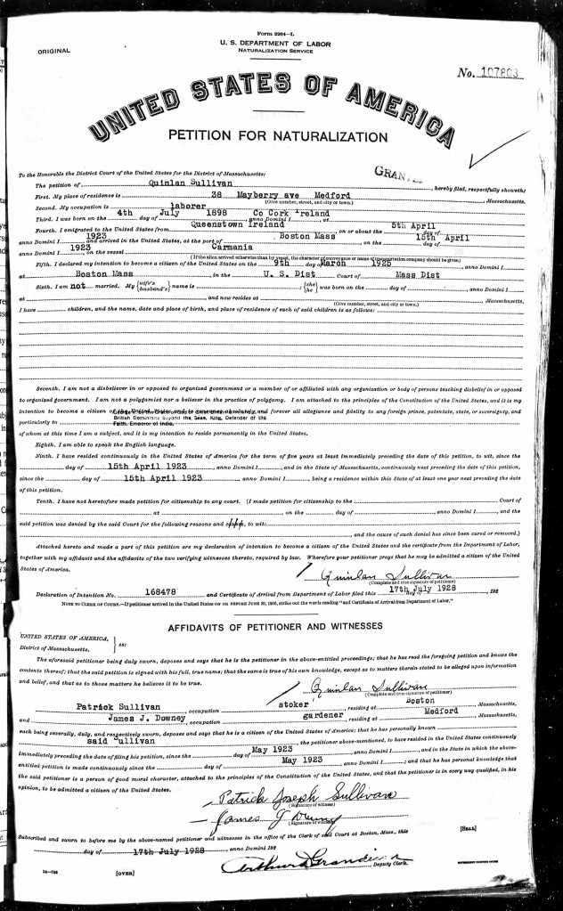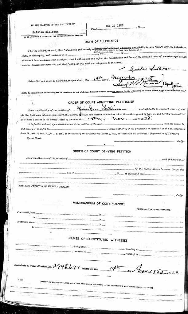 Quinlan declared his intention to seek US citizenship in 1925, as can be seen in the first image below. The second image, in July 1928, shows his petition witnessed by his brother Patrick and James Downey. The third image is from November 1928, when his petition is accepted.