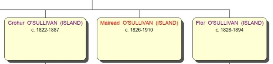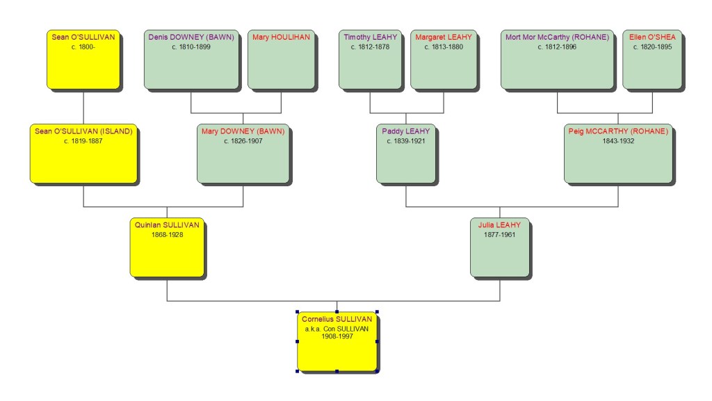 Click on the branch to see information about Sean O’Sullivan (Island). The diagram below shows the tree to his great grandson, Con)