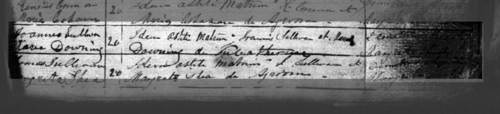 Idem Astitu Matrimus Joannus Sullivan et Maria Downing de Kilcatherine