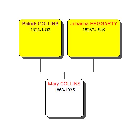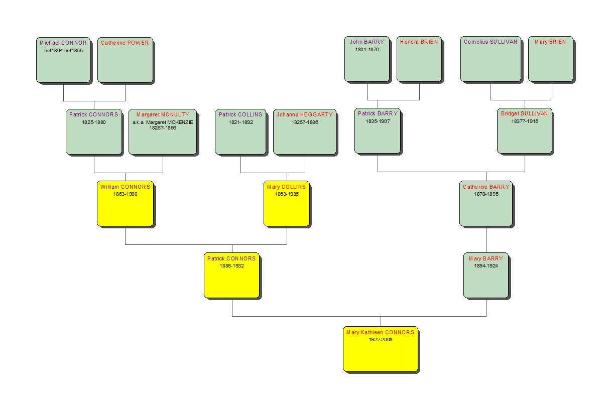 Click on the branches to see information about William and Mary’s children. The diagram below shows the tree to their granddaughter, Mary Connors.